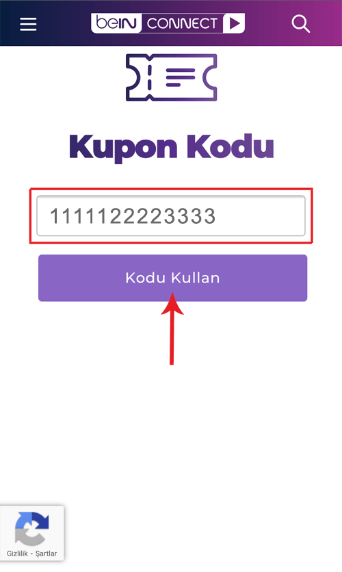 1- SMS ve E-Posta ile tarafınıza iletilen beIN CONNECT kupon kodunuzu https://www.todtv.com.tr/kupon-kodu kutucuğuna girdikten sonra “Kodu Kullan” butonuna tıklayın.